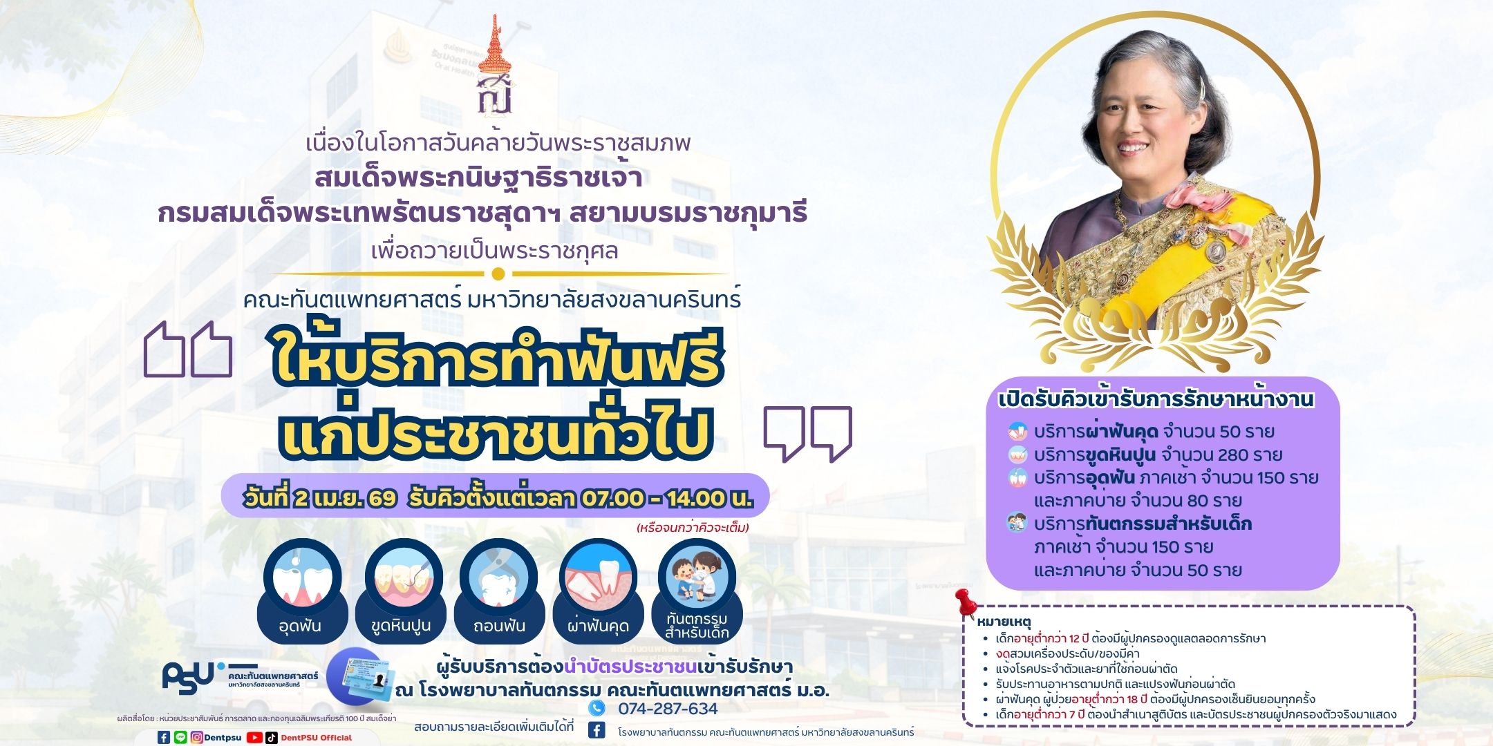 โรงพยาบาลทันตกรรม คณะทันตแพทยศาสตร์ ม.อ. ขอเชิญประชาชนทั่วไปเข้ารับบริการทางทันตกรรมโดยไม่คิดมูลค่า เพื่อถวายเป็นพระราชกุศลเนื่องในโอกาสวันคล้ายวันพระราชสมภพ สมเด็จพระกนิษฐาธิราชเจ้า กรมสมเด็จพระเทพรัตนราชสุดาฯ สยามบรมราชกุมารี