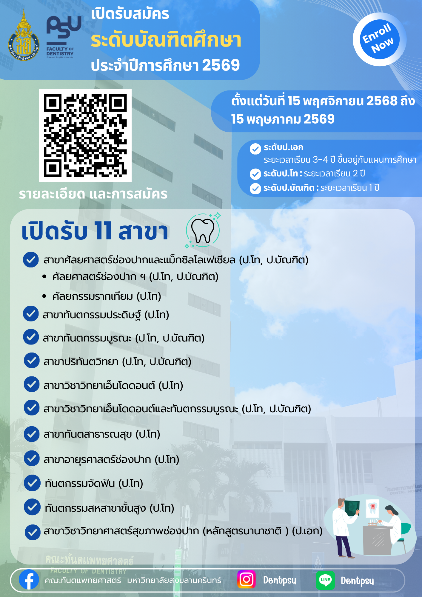 ท่านใดที่สนใจอยากจะเรียนต่อในสาขาของคณะทันตแพทยศาสตร์ ม.อ. สามารถ ดูรายละเอียดเพิ่มเติมแต่ละสาขาได้ที่ลิงก์ https://shorturl.asia/d4Fn1 หรือ Scan QR code ข้างต้น มาเป็นเด็กทันตแพทย์ ที่ ม.อ. กันเยอะๆนะคะ