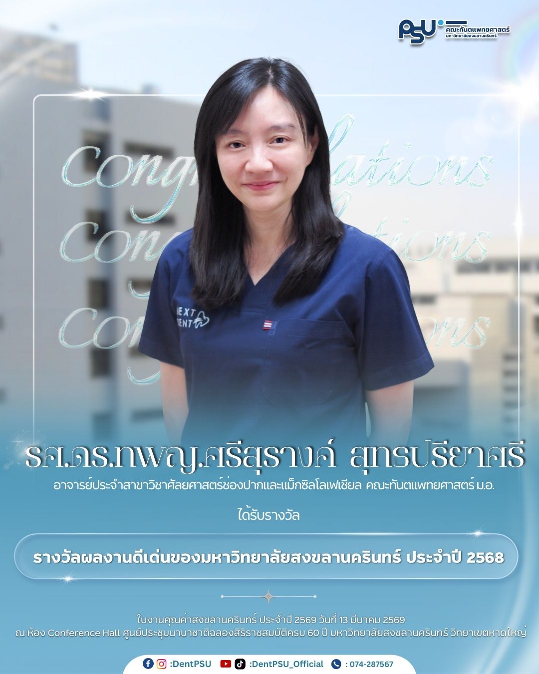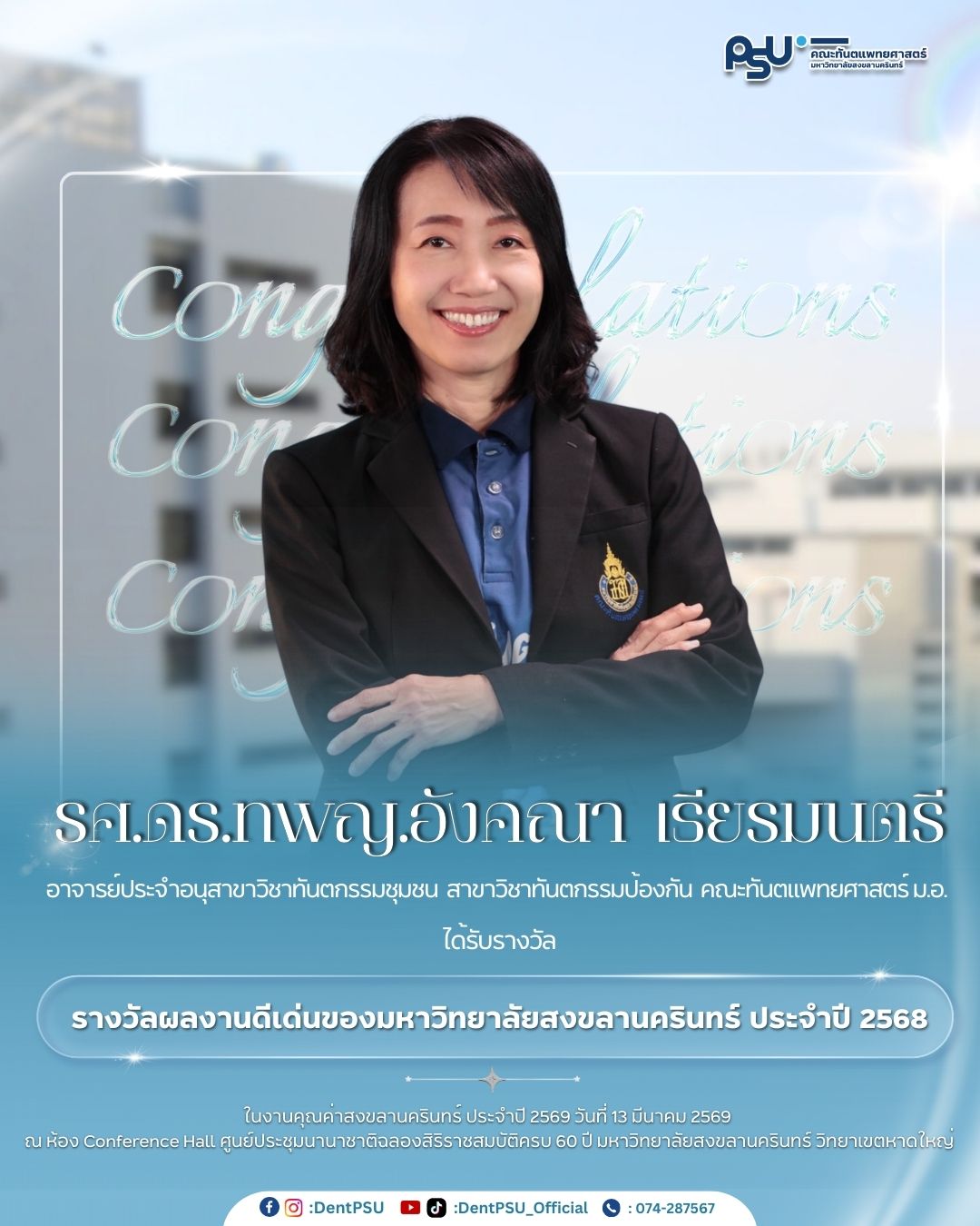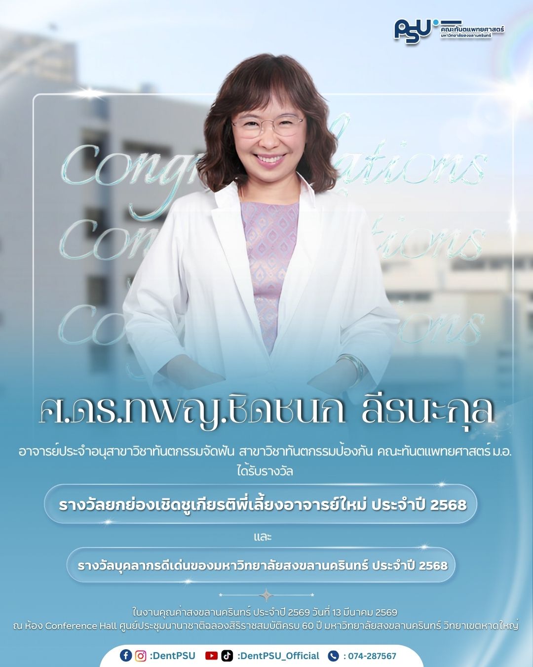 คณะทันตแพทยศาสตร์ ม.อ. ขอร่วมแสดงความยินดีกับคณาจารย์ที่ได้รับรางวัลเชิดชูเกียรติในงาน”คุณค่าสงขลานครินทร์ ประจำปี 2569 ” ซึ่งจัดขึ้นในวันที่ 13 มีนาคม 2569 เวลา 16.30 – 19.30 น. ณ ศูนย์ประชุมนานาชาติฉลองสิริราชสมบัติครบ 60 ปี มหาวิทยาลัยสงขลานครินทร์ วิทยาเขตหาดใหญ่