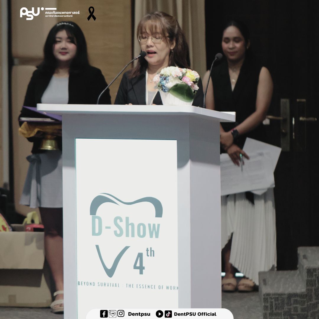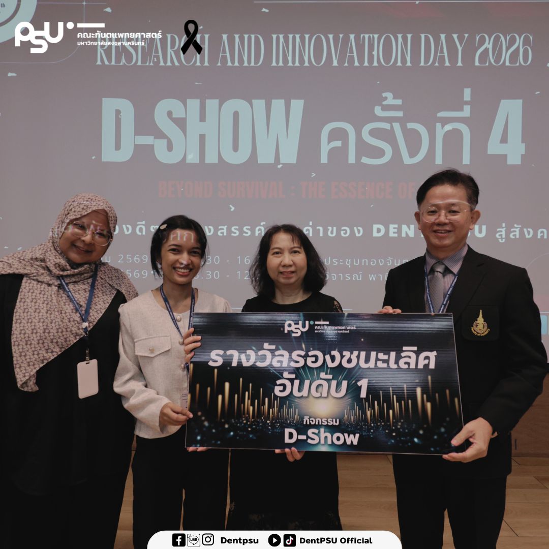 คณะทันตแพทยศาสตร์ ม.อ. จัดกิจกรรม D-SHOW #4 ประจำปี 2569 (Research and Innovation Day 2026) ภายใต้ธีม “Beyond Survival : The Essence of Work” เวทีเรื่องดี ๆ สร้างสรรค์คุณค่า Dent-PSU สู่สังคม ซึ่งเป็นเวทีที่ได้ให้บุคลากรภายในคณะ ได้สร้างสรรค์ผลงานที่มีคุณค่าต่อสังคม สู่การสร้างคุณค่าอย่างยั่งยืน ในระหว่างวันที่ 7-8 มกราคม 2569 ณ ห้องประชุมทองจันทร์ หงส์ลดารมภ์ และวิจารณ์ พาณิช อาคารเรียนรวม คณะแพทยศาสตร์ ม.อ.