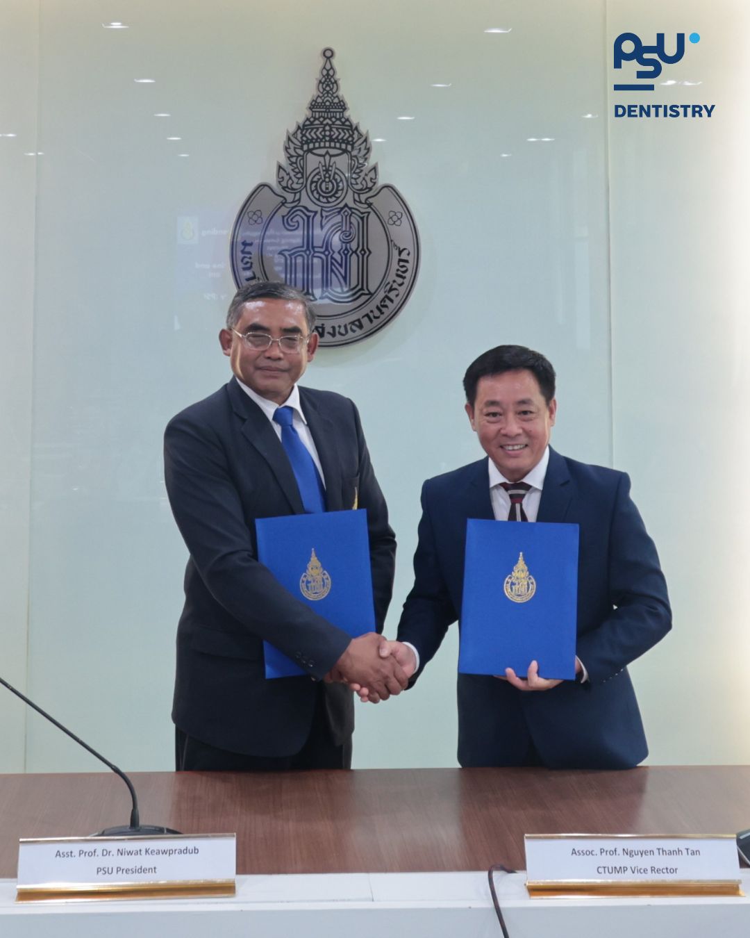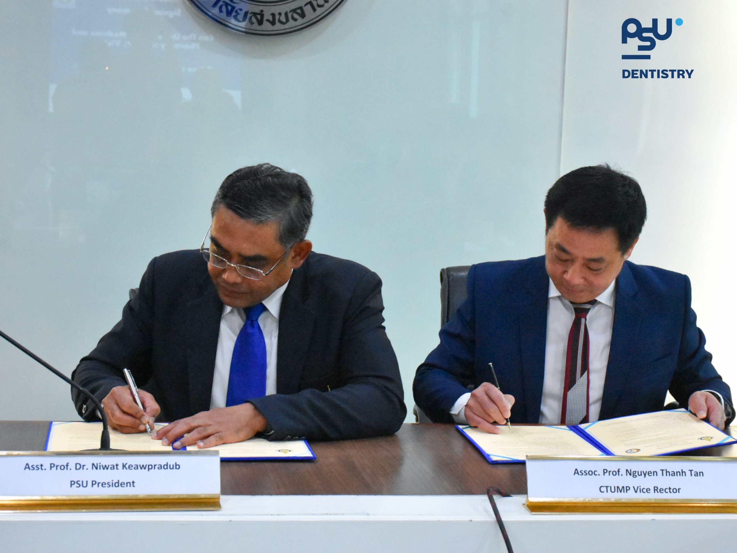 On June 25th, 2024, Faculty of Dentistry, Prince of Songkla University (PSU), led by Assoc.Prof.Dr.Songchai Thitasomakul, Dean of the Faculty of Dentistry, along with Asst. Prof. Chakree Ongthiemsak, Vice Dean for Academic and International Affairs and Dr. Chirayu Ruengrungsom, Assistant Dean for Postgraduate Studies and International Affairs, participated in the formal signing ceremony of an academic Memorandum of Understanding (MoU) at the university level. This ceremony was led by Asst. Prof. Dr. Niwat Keawpradub, PSU President, and Asst. Prof. Dr. Thakerng Wongsirichot, Vice President for Academic and International Affairs, held at Meeting Room 215, Office of the President Building.