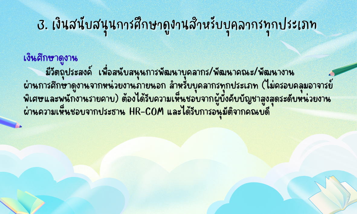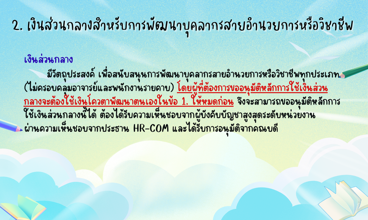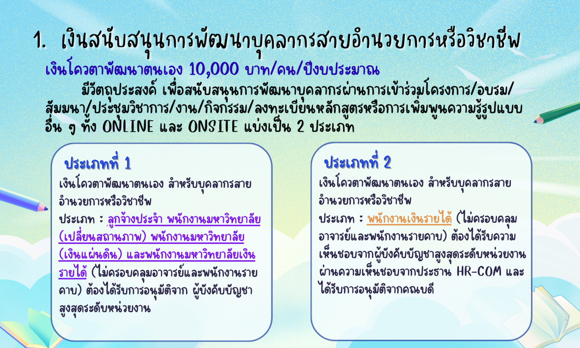 - กระบวนการขออนุมัติหลักการใช้เงินสนับสนุนการพัฒนาตนเองและการศึกษาดูงานในแต่ละประเภท