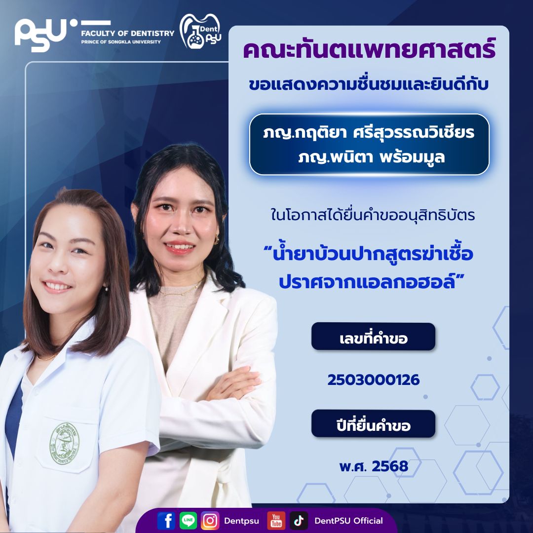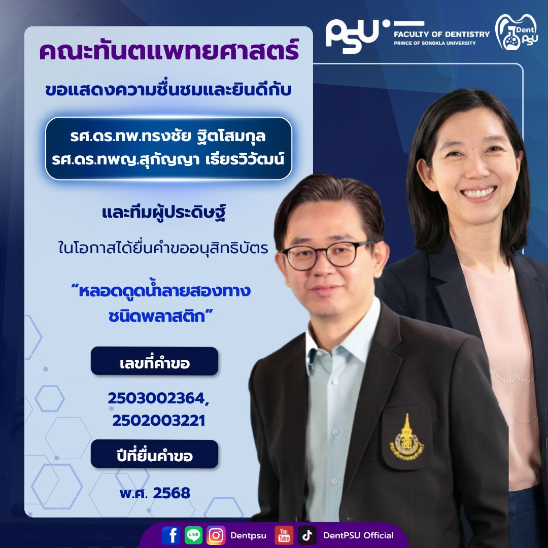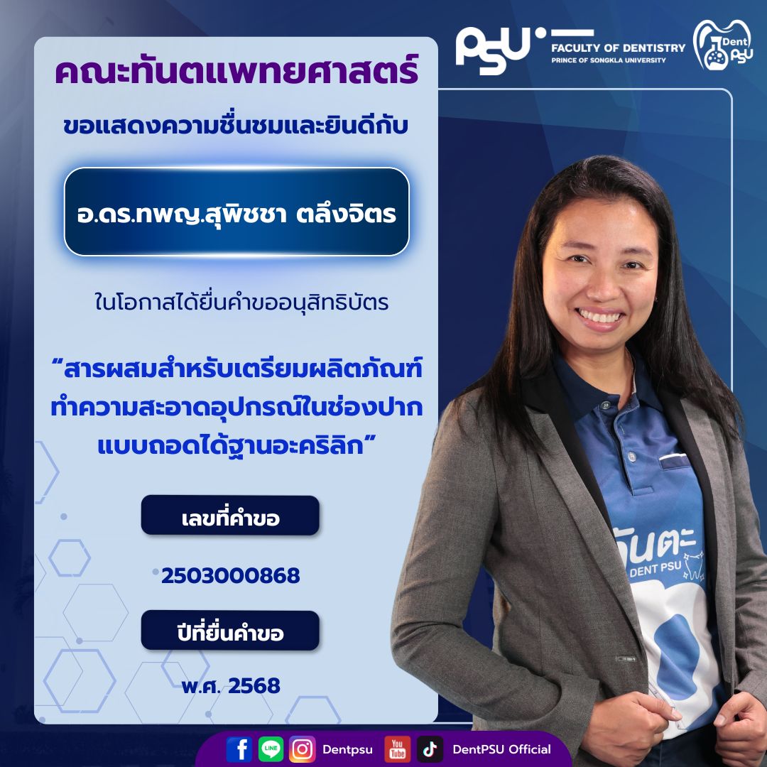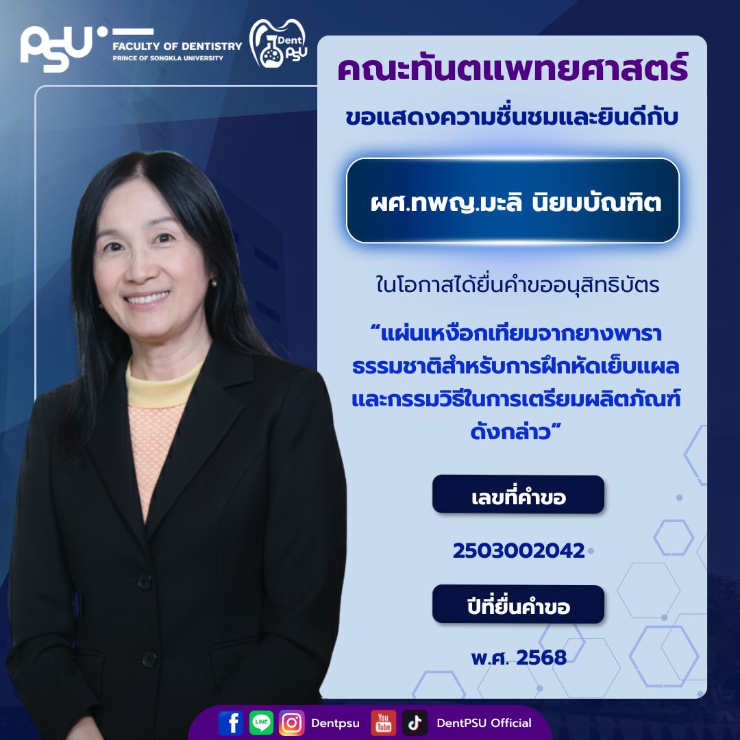 ความสำเร็จในครั้งนี้เป็นเครื่องตอกย้ำถึงพันธกิจของคณะทันตแพทยศาสตร์ มหาวิทยาลัยสงขลานครินทร์ ที่มุ่งเน้นการขับเคลื่อน “งานวิจัยสู่นวัตกรรม และนวัตกรรมสู่การใช้ประโยชน์จริง” คณะฯ ขอขอบพระคุณคณาจารย์ นักวิจัย และบุคลากรทุกท่านที่ร่วมกันสร้างสรรค์ผลงานอันทรงคุณค่า และร่วมเป็นส่วนหนึ่งในการสร้างชื่อเสียงให้แก่องค์กรอย่างต่อเนื่อง