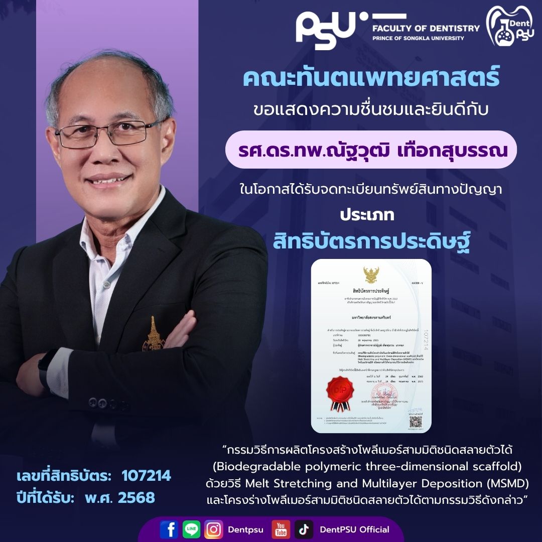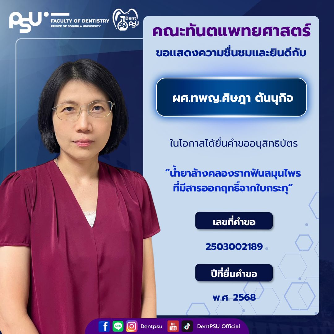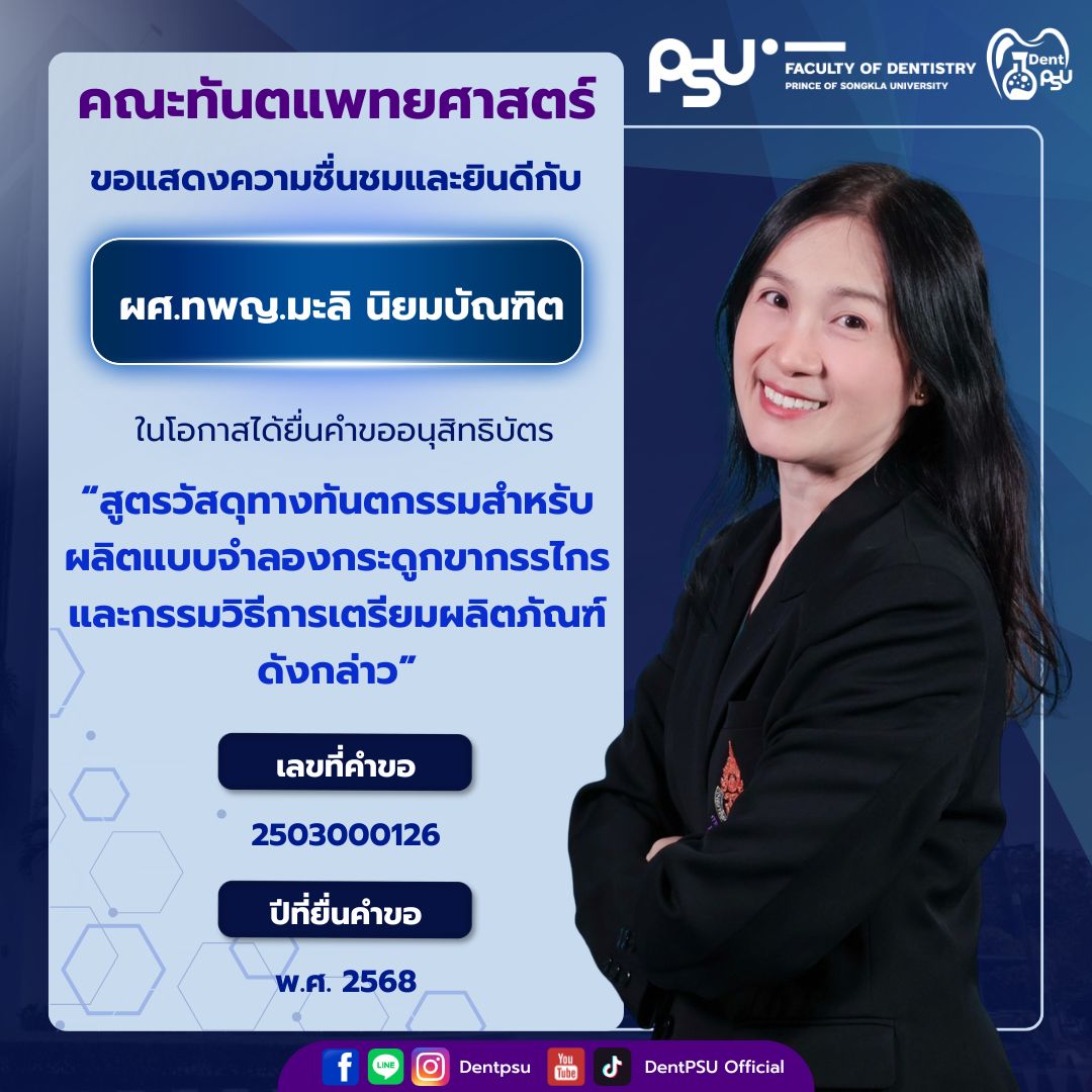 ความสำเร็จในครั้งนี้เป็นเครื่องตอกย้ำถึงพันธกิจของคณะทันตแพทยศาสตร์ มหาวิทยาลัยสงขลานครินทร์ ที่มุ่งเน้นการขับเคลื่อน “งานวิจัยสู่นวัตกรรม และนวัตกรรมสู่การใช้ประโยชน์จริง” คณะฯ ขอขอบพระคุณคณาจารย์ นักวิจัย และบุคลากรทุกท่านที่ร่วมกันสร้างสรรค์ผลงานอันทรงคุณค่า และร่วมเป็นส่วนหนึ่งในการสร้างชื่อเสียงให้แก่องค์กรอย่างต่อเนื่อง