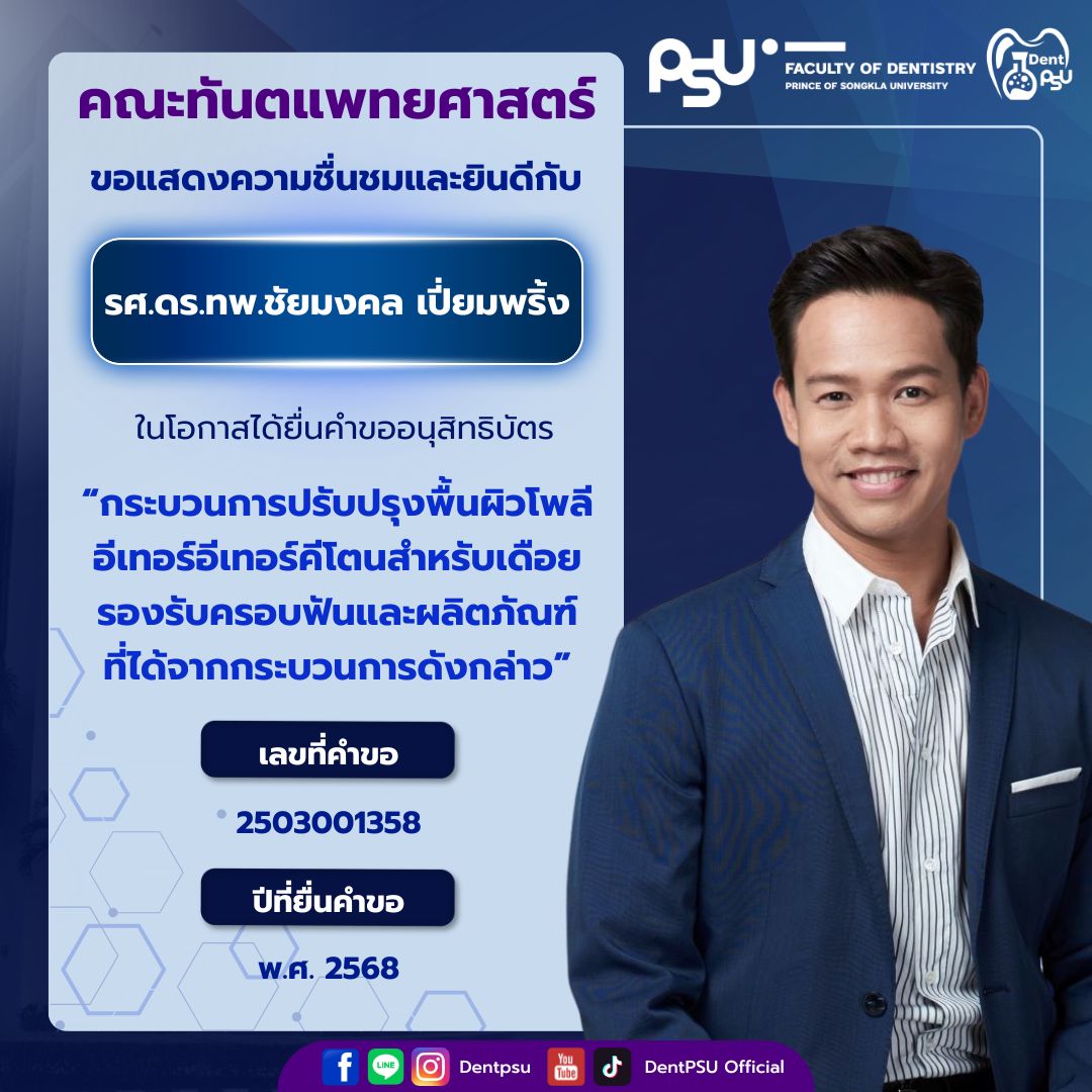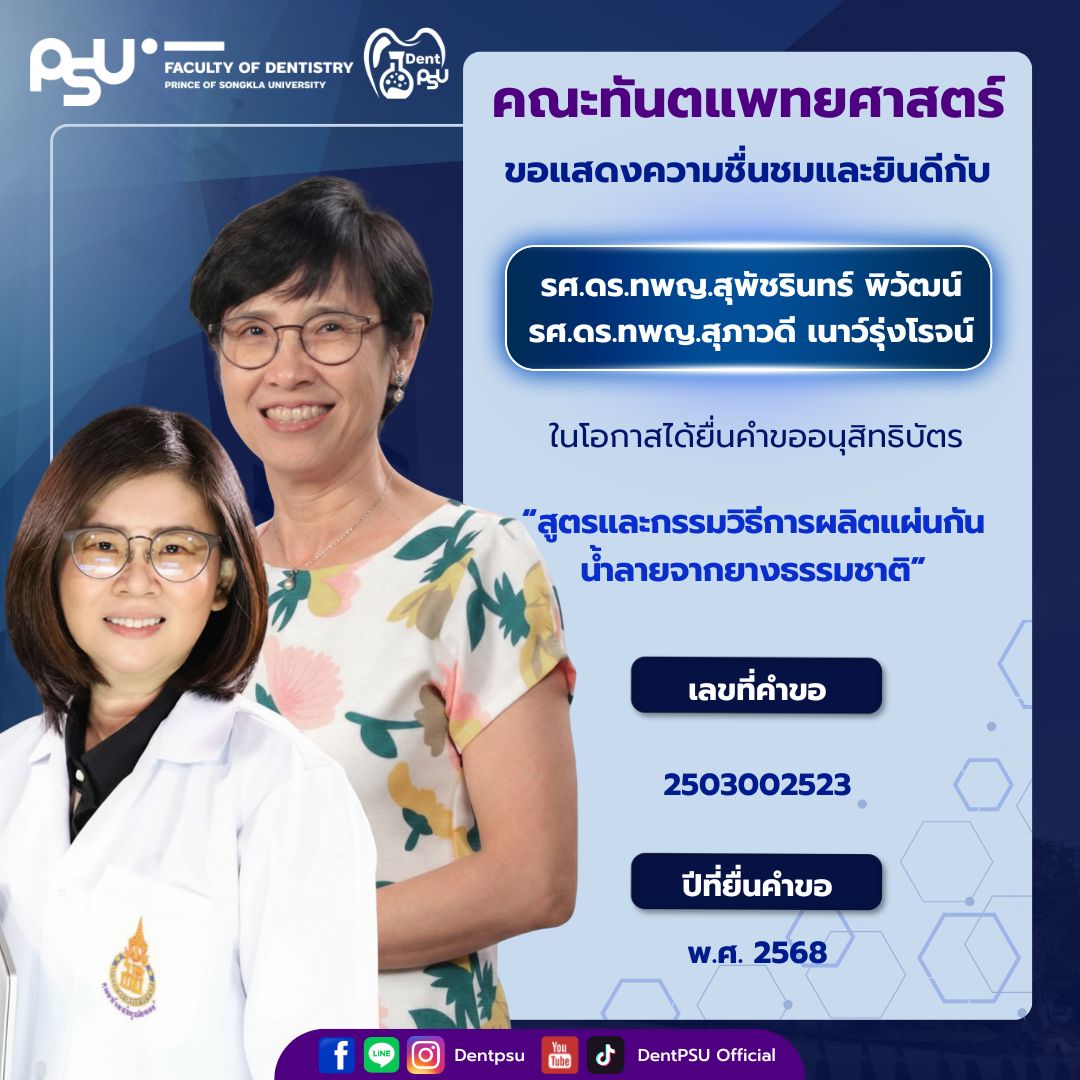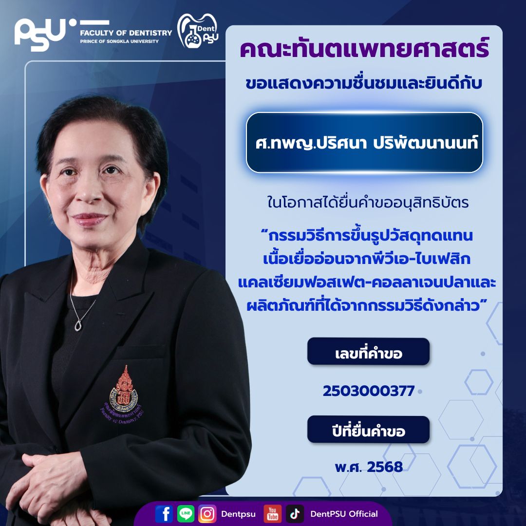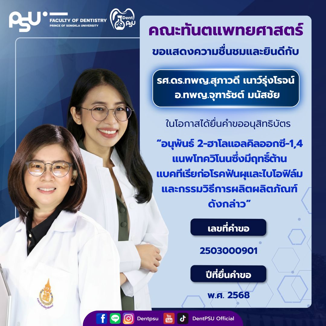 ความสำเร็จในครั้งนี้เป็นเครื่องตอกย้ำถึงพันธกิจของคณะทันตแพทยศาสตร์ มหาวิทยาลัยสงขลานครินทร์ ที่มุ่งเน้นการขับเคลื่อน “งานวิจัยสู่นวัตกรรม และนวัตกรรมสู่การใช้ประโยชน์จริง” คณะฯ ขอขอบพระคุณคณาจารย์ นักวิจัย และบุคลากรทุกท่านที่ร่วมกันสร้างสรรค์ผลงานอันทรงคุณค่า และร่วมเป็นส่วนหนึ่งในการสร้างชื่อเสียงให้แก่องค์กรอย่างต่อเนื่อง